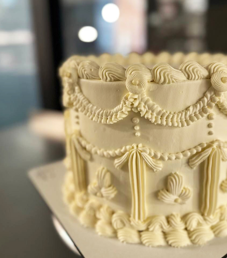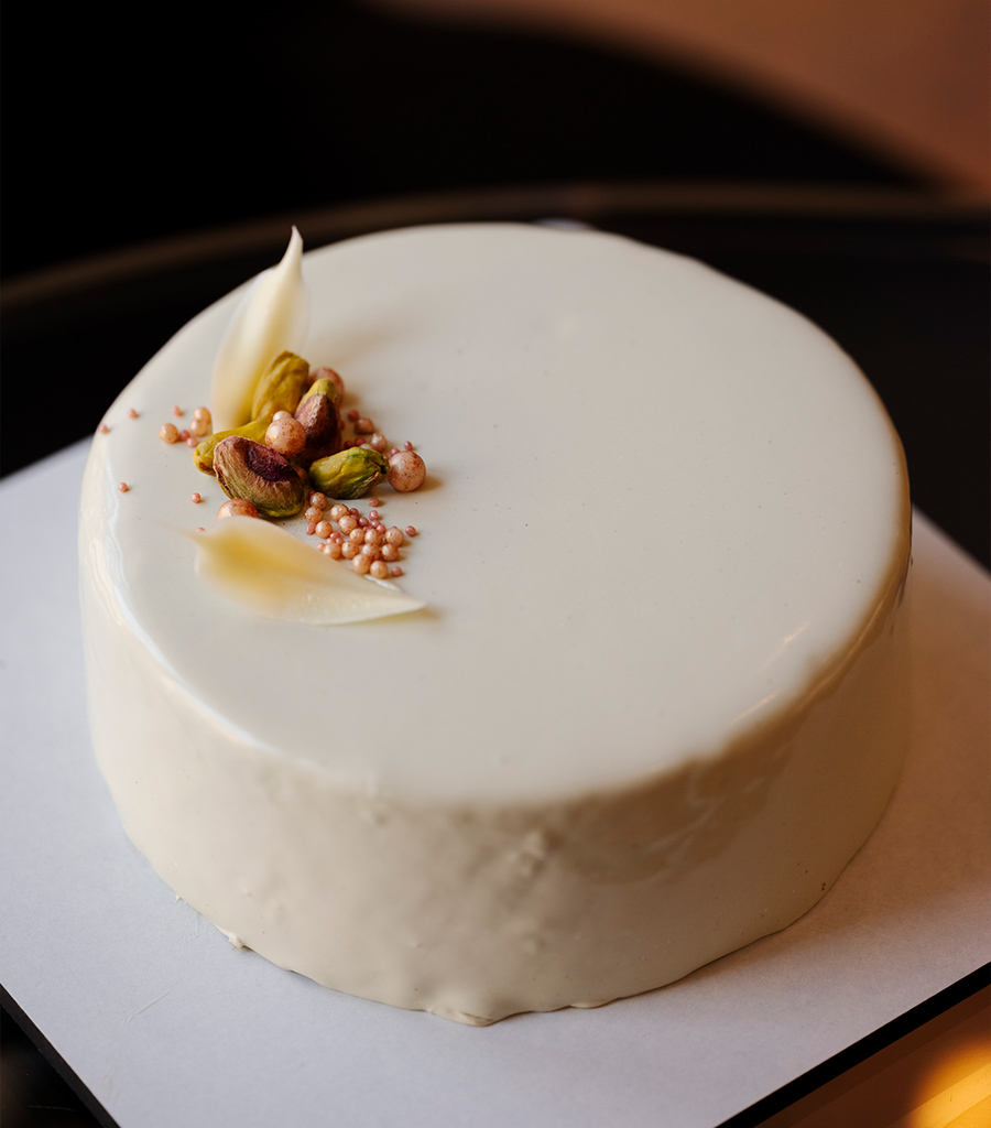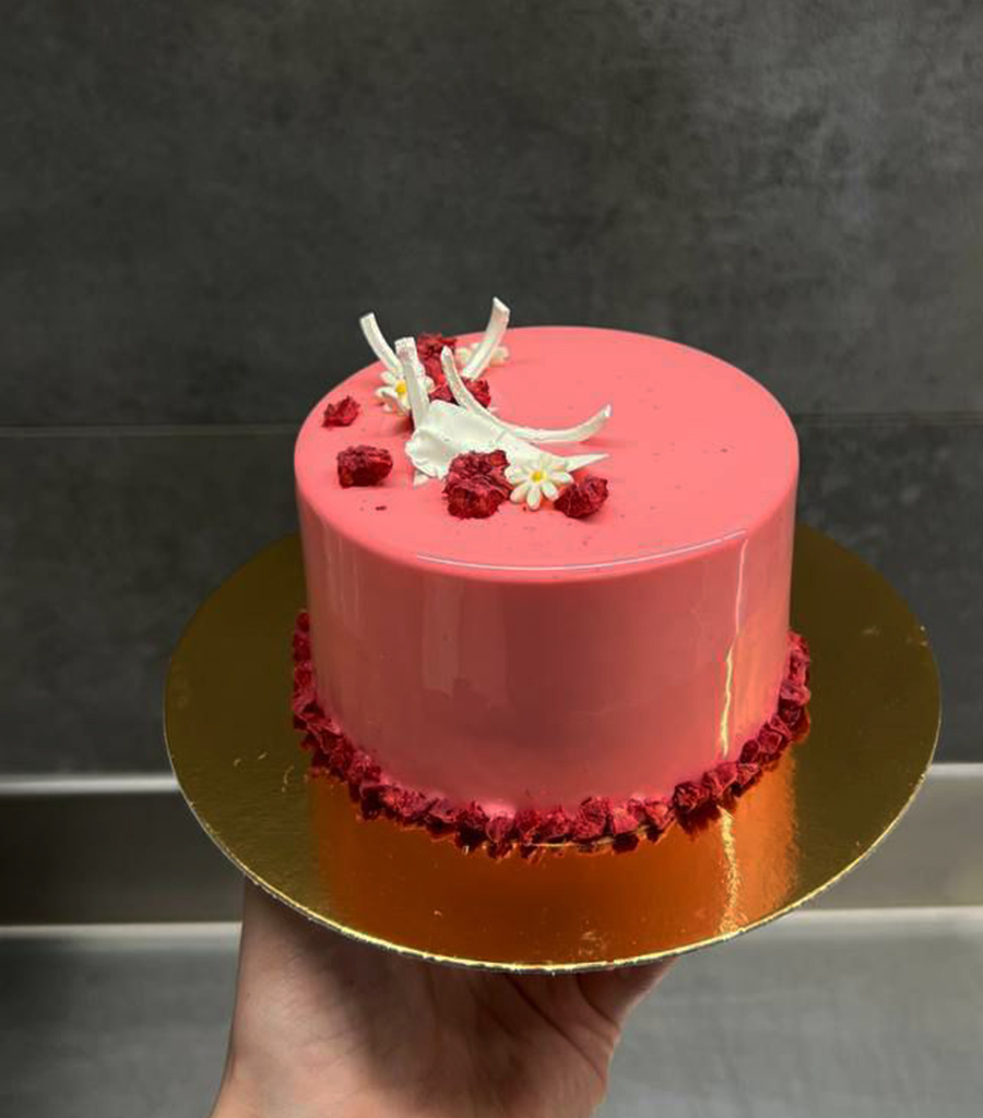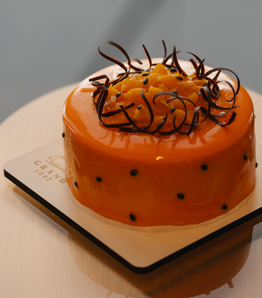 Mus waniliowy z serem mascarpone, Wkład mix cytrusów (pomarańcza, mandarynka, yuzu), Chrupka prażynka, Biszkopt financjer migdałowy (gluten-free), Glazura lub zamsz (kolor do ustalenia), Życzenia odnośnie dekoru.